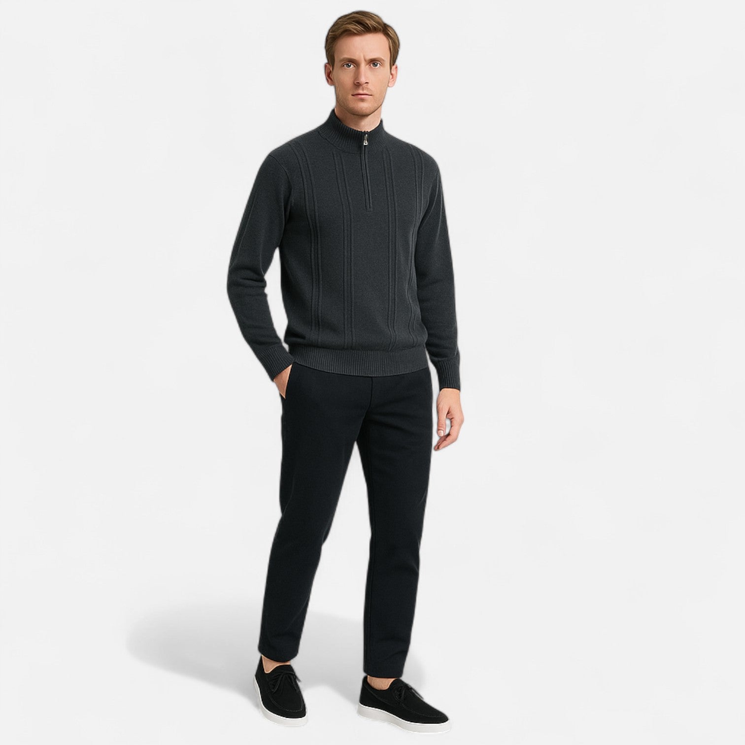 Half-Zip Collar – Offers versatile styling and easy layering, from casual elegance to refined smart-casual looks.
